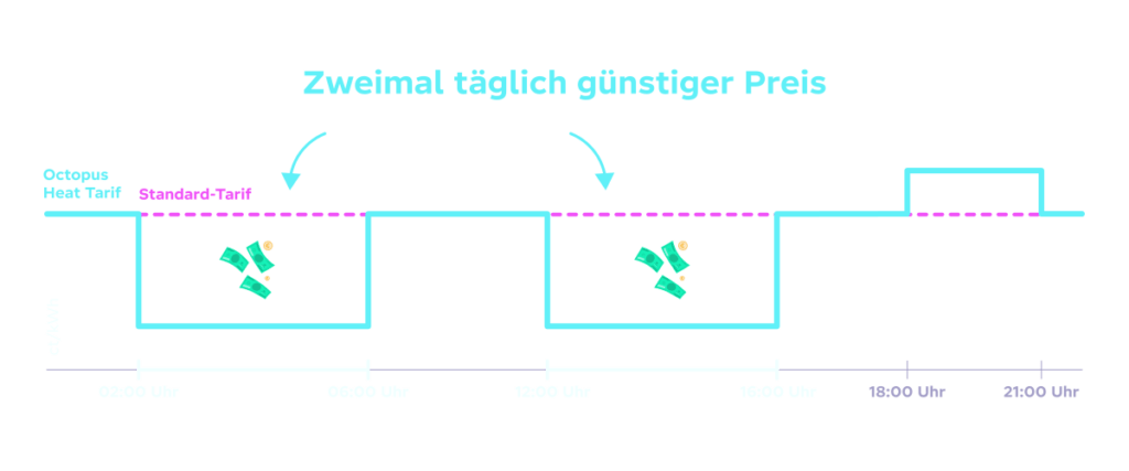 Zwei mal täglich in den Zeiten von 02:00-06:00Uhr und von 12:00-16:00Uhr zahle ich einen niedrigen Tarif, in den Zeitfenstern 06:00-12:00 / 16:00-18:00 / 21:00-02:00 Uhr einen mittleren Tarif und nur in der Zeit von 18:00-21:00Uhr einen hohen Stromtarif.