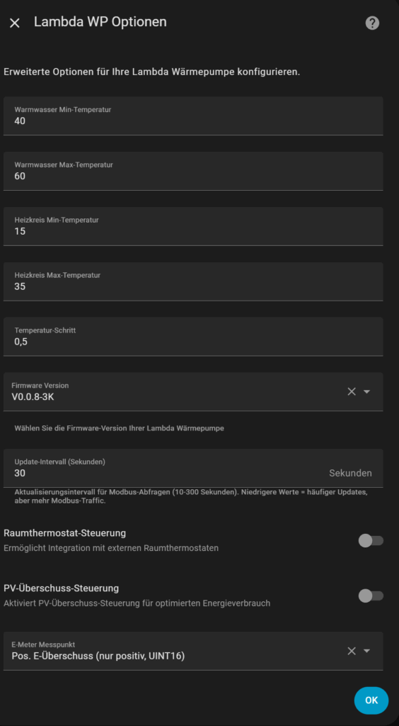 Nach der Einrichtung können Sie einige Optionen über Einstellungen -> Geräte & Dienste -> Lambda Heat Pumps -> Konfigurieren anpassen: