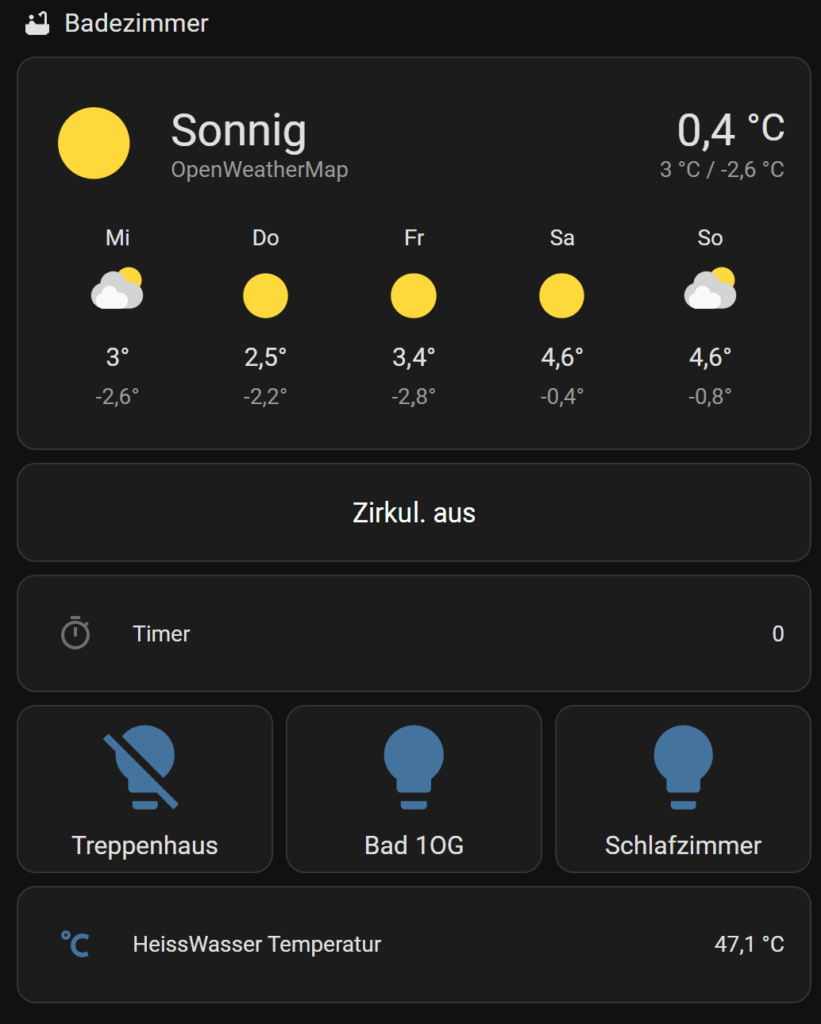 Also habe ich über einen Shelly und Home Assistant eine Anforderungssteuerung realisiert. Super simpel. Eine Automatisierung schaltet die Zirkulationspumpe für 3 min an, danach wieder aus. Die drei Minuten habe ich ausprobiert, nach drei Minuten ist bei uns das Wasser im Bad auf einer angenehmen Temperatur zum Duschen. Diese Automatisierung kann ich über die Home Assistant APP auf dem Handy ansteuern und im Bad liegt ein Sonoff Button, über den dann auch die Pumpe angeht.